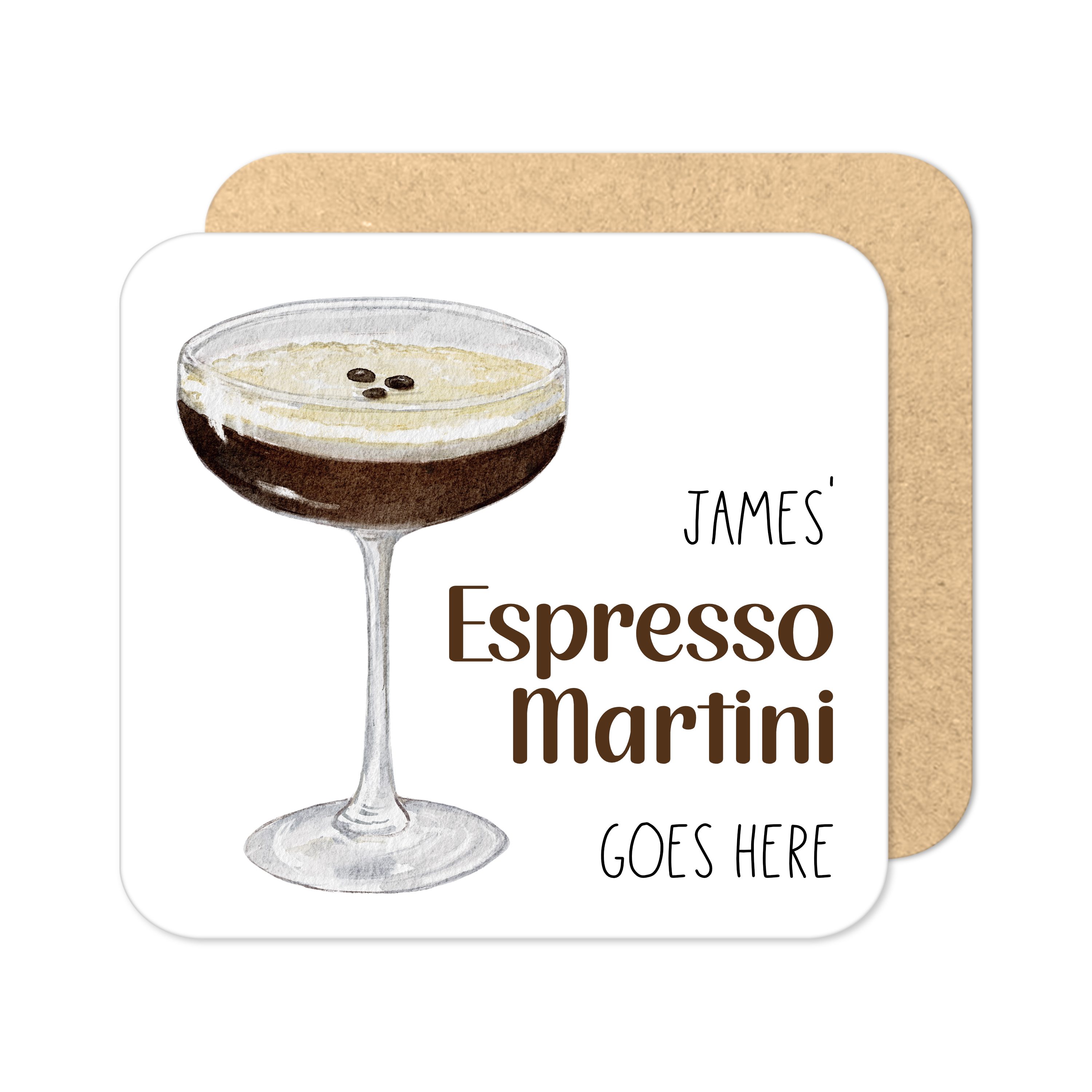 An alternative coaster collection featuring large watercolour images of drinks and smaller personalisation details at the bottom. Quick and easy to personalise!